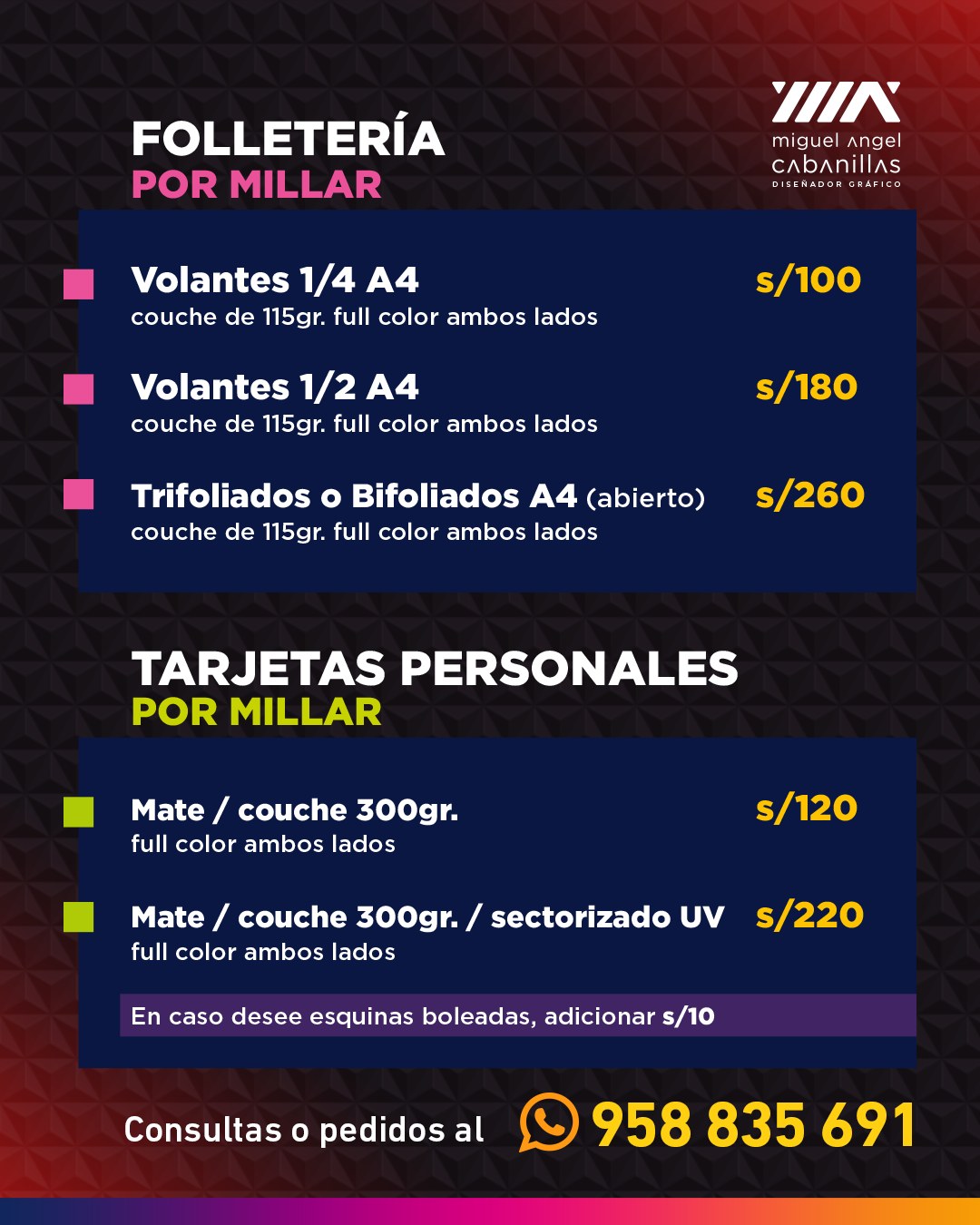 📢👍Hola amigos soy Miguel Angel Cabanillas, diseñador gráfico. estoy para ayudarte en el desarrollo de logotipos, material gráfico e ilustraciones para cualquier tipo de proyecto. ⚡⚡Mi compromiso es brindarte soluciones creativas con puntualidad y eficiencia.✒️✏️✒️